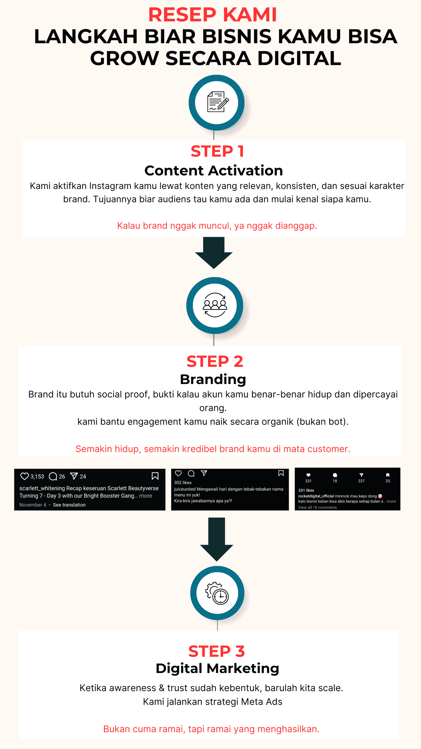 Layanan kami membantu naik kelas secara bertahap: dari dikenal → dipercaya → dibeli.